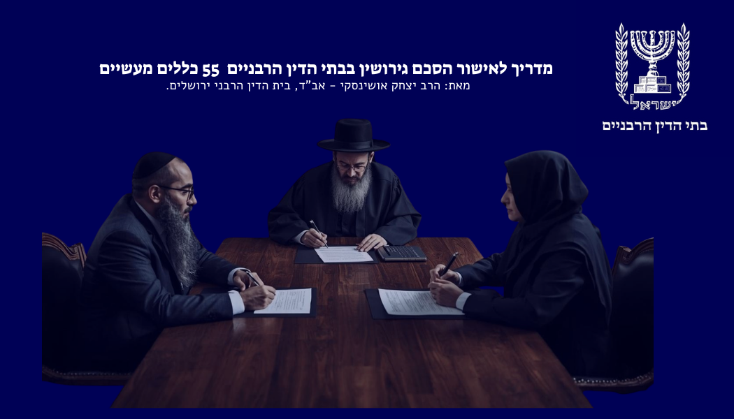 בית הדין הרבני בירושלים מציג את "55 הכללים המעשיים" לאישור הסכם גירושין – מדריך הלכתי מקיף מאת הרב יצחק אושינסקי, אב"ד בבית הדין הרבני בירושלים, העוסק במכלול הסוגיות הנוגעות לאישור, תוקף ואכיפת הסכמי גירושין.